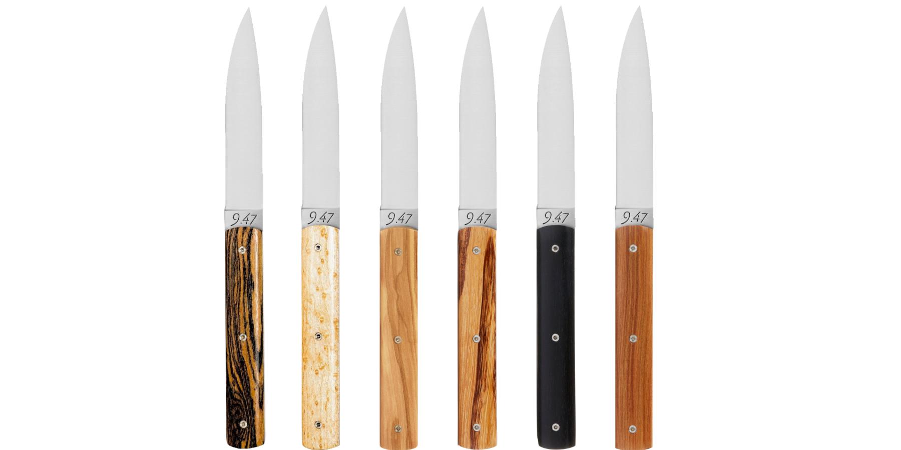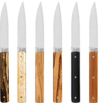This set includes 6 table knives, each featuring a handle crafted from a distinct wood species, carefully selected for its beauty and unique character: