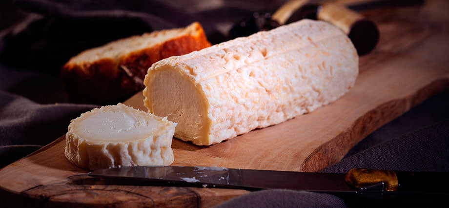 • Appearance: Small log-shaped cheese with a thin, wrinkled, bloomy rind.