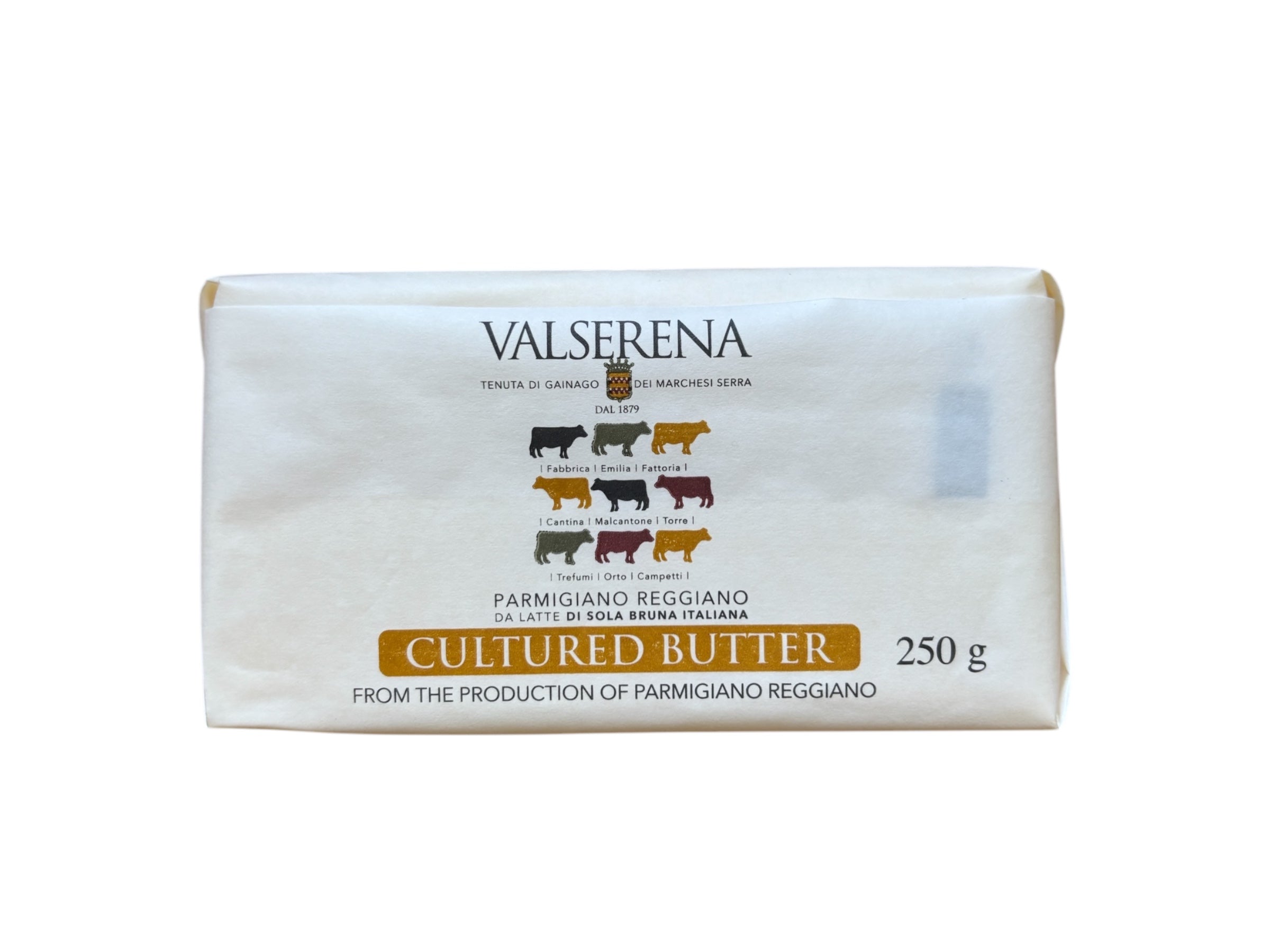 Valserena is a lightly cultured butter made from hand-skimmed cream of Sola di Bruna cows as part of the traditional production of Valserena Parmigiano Reggiano.