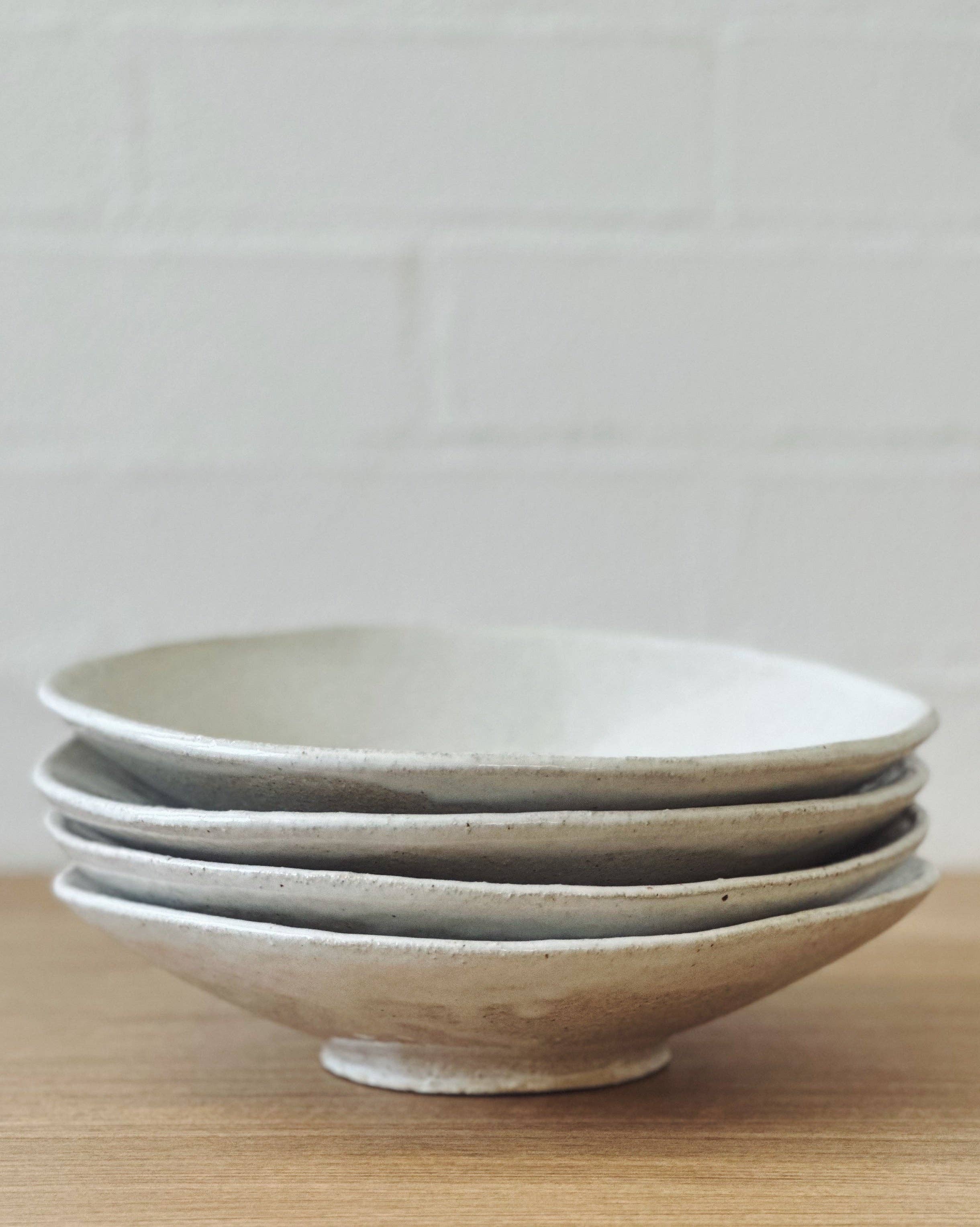 These white sabi bowls are the perfect piece for any table. With a small foot to give them a little lift, these handmade bowls are the perfect combination of gently textured white clay and lush white glaze.